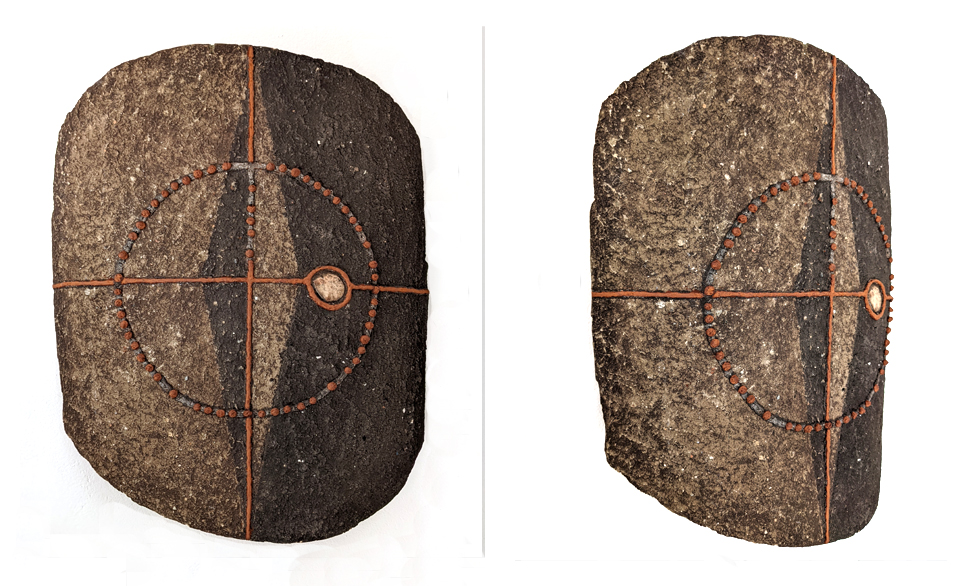 Rosarium - in memoriam (2022), Erde, Eisenocker auf Holzstammfragment 47 x 43 cm