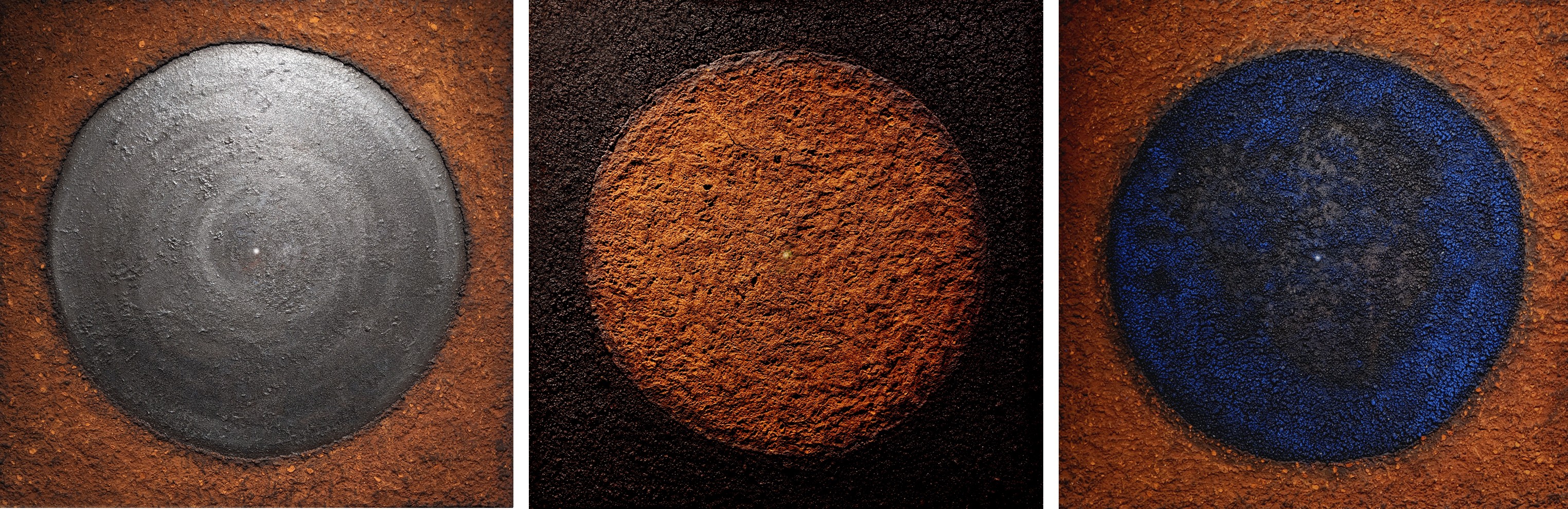 Ockerfelder (2023) Eisenocker, Flockengrafit, Erde, Pigment, Leinwand, je 100 x 100 cm